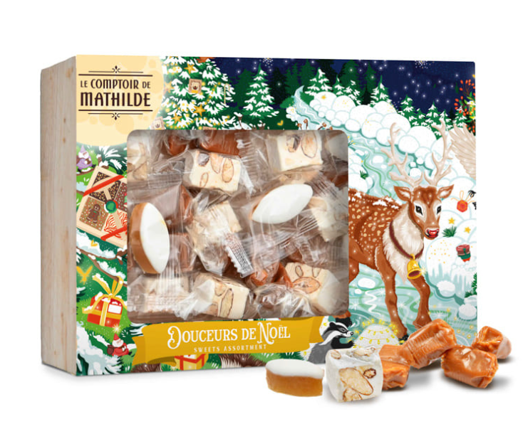 Ingrédients : Bonbons de caramel au beurre salé 50,4% (sirop de glucose, sucre, LAIT concentré sucré, BEURRE 10%, poudre de LAIT, sel de Guérande 0,8%, fleur de sel de Guérande 0,3%), nougats aux amandes et au miel 36,8% (sucre cristal, AMANDES entières 21,19%, glucose, miel 14,41%, sirop de sucre inverti cristallisé, poudre de blanc d'ŒUFS, pain azyme (fécule de pomme de terre, eau), calissons 12,8% (melon confit (melon, sirop de glucose-fructose, sucre, correcteur d'acidité : acide citrique), AMANDES, oranges confites (cubes d'écorces d'orange, sirop de glucose-fructose, sucre, correcteur d'acidité : acide citrique), sucre cristal, sucre glace amylacée, eau, sirop de glucose, sucre inverti (sucre, eau), pain azyme (fécule de pomme de terre, eau), eau, blanc d'OEUF, arôme naturel de vanille, arôme naturel d'amande amère).
